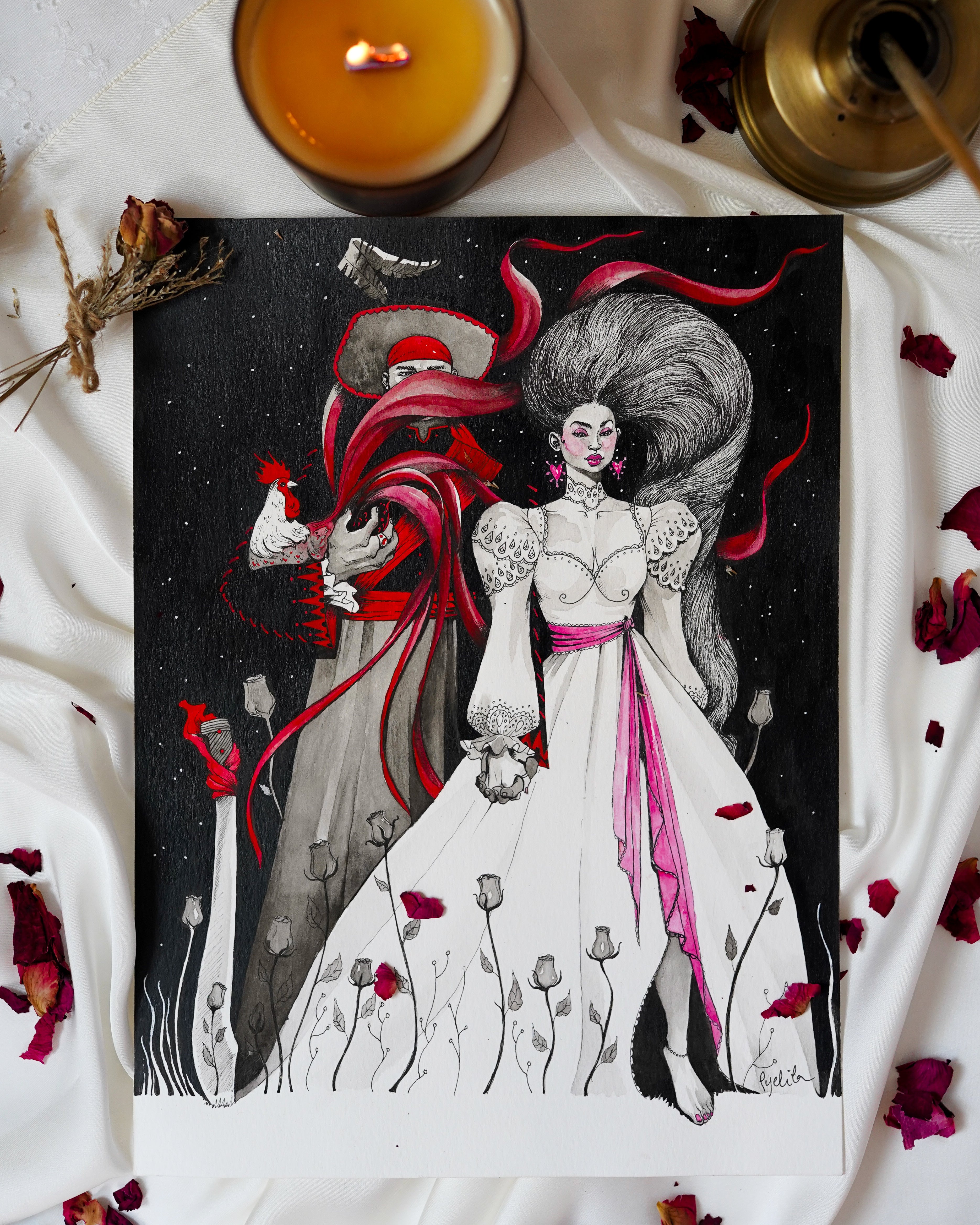 This artwork honors the eternal dance between Ogou Feray and Èzili Freda, two powerful spirits of Haitian Vodou whose love burns with both passion and pain. Ogou Feray, the warrior of iron and fire, embodies courage, discipline, and strength — a protector whose heart is forged in battle. Ezili Freda, the loa of beauty, romance, and dreams, is his opposite and his mirror, graceful, tender, and radiant as the shimmer of gold and rose.